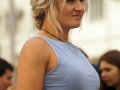 Ольга предпочла максимально комфортную одежду для соревнований – кроссовки, майку, обтягивающие джинсовые шорты, подчеркивающие её спортивную фигуру. Образ она разбавила крупными белыми часами со стразами.