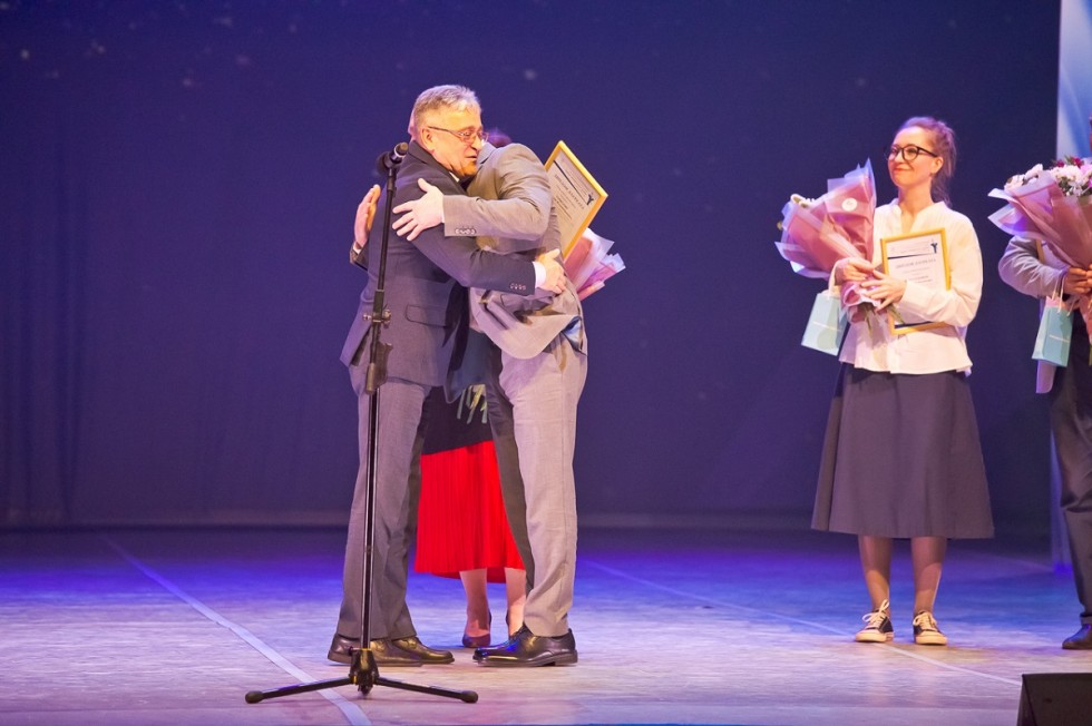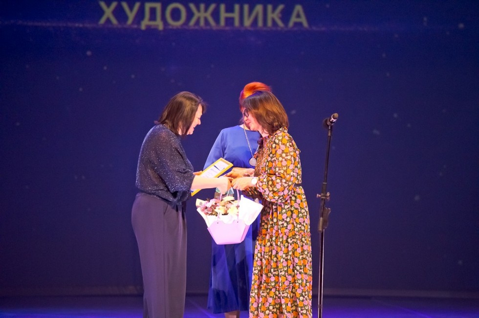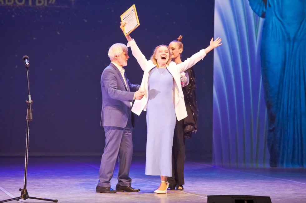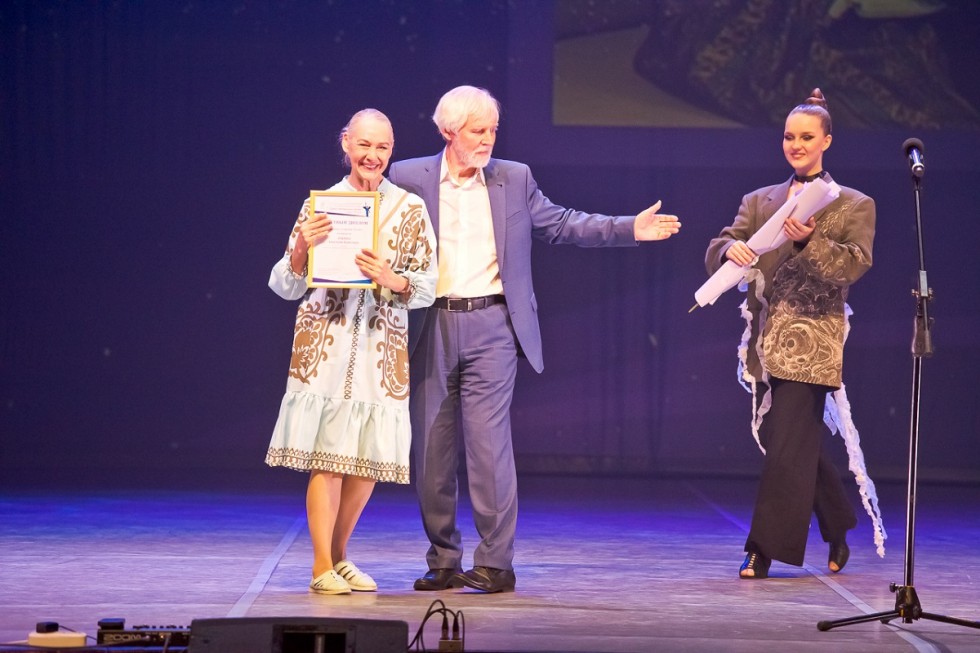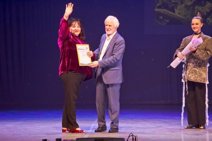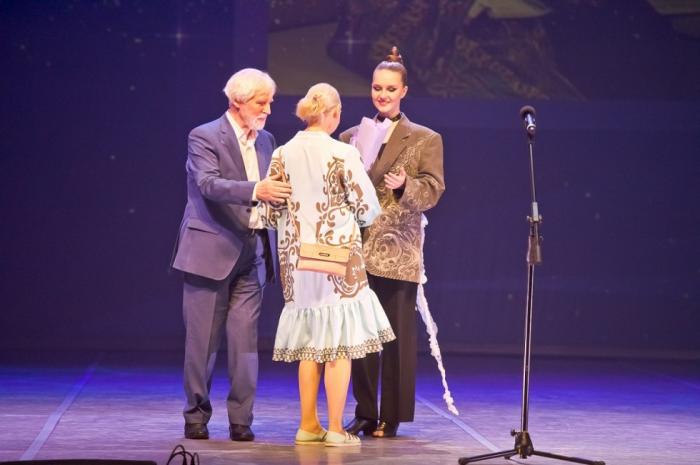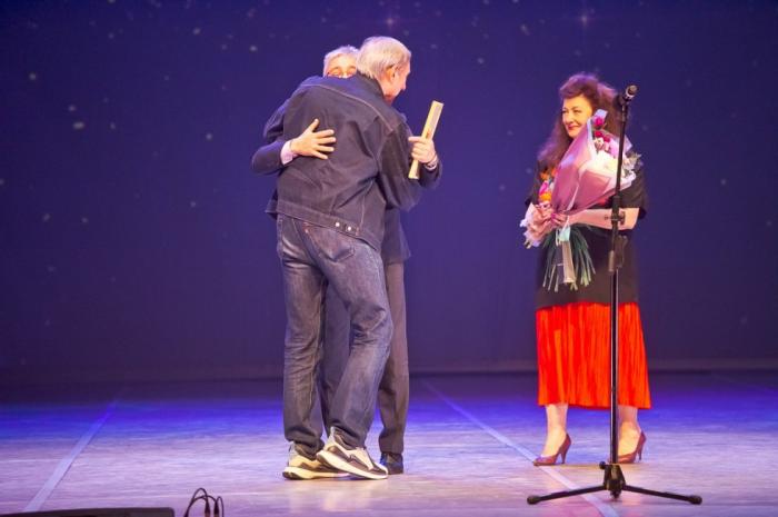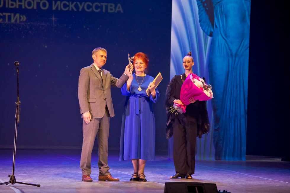 Действующий министр культуры Юрий Трофимов награждает за вклад некогда тоже руководителя областной культсферы Нину Генову. На прощание чиновные творцы вспомнили скульптуру Веры Мухиной "Рабочий и колхозница". Вышло талантливо.