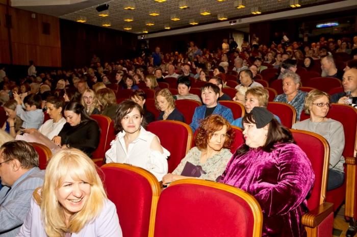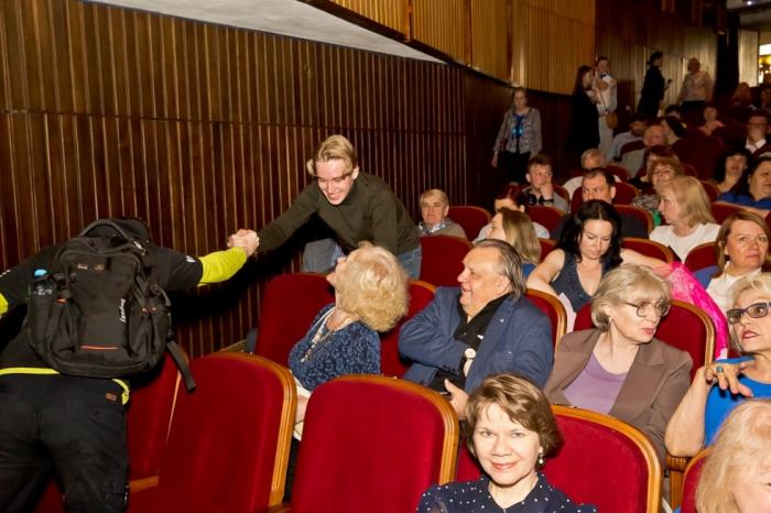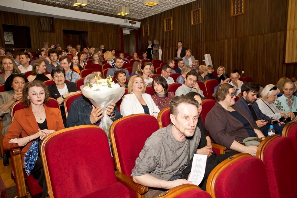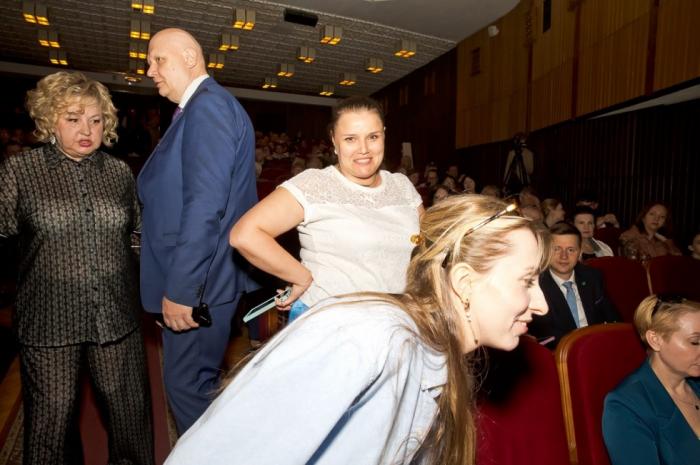 В зале собралось много тех, кто в силу загруженности давно не виделся. Рукопожатие через заслуженную. Имеется в виду заслуженная артистка России Ирина Трусова.