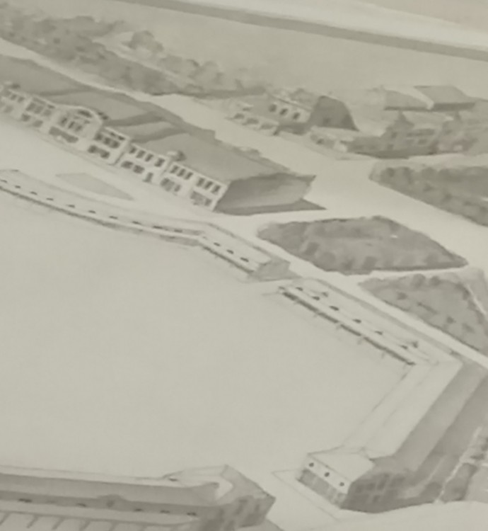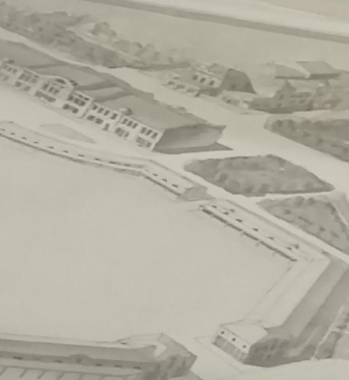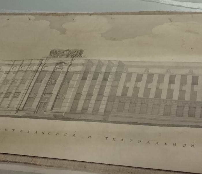 Не нашедший воплощения проект одного из худпромовцев, по всей вероятности, торговая зона возле театра драмы. Храм Мельпомены в верхней части снимка, а сама площадь должна была быть реализована на месте нынешнего врубелевского корпуса музея. Постройки планировались деревянными.