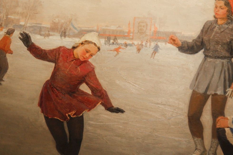 Произведение выдержано в духе социалистического реализма. На ней увлеченные фигурным катанием девушки, одна из которых чуть старше по возрасту и явно наставник.