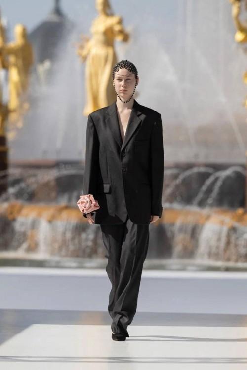 «В линейке — брючные костюмы и смокинги в черной гамме с акцентными деталями: пыльно-розовыми платками в карманах, различными вырезами в зоне декольте, декоративными черными шарфами и накидками.