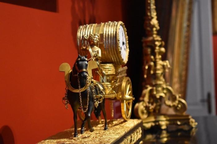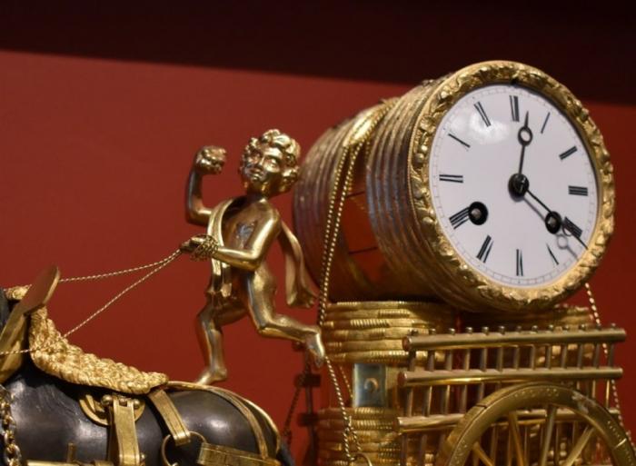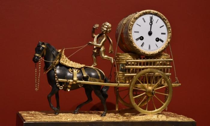 Часы «Повозка Вакха», посвященная богу виноделия Бахусу, в запасники омичей поступила в 1925 году. Владелец значился в особом государственном перечне конфискованных ценностей под номером 474. Он соответствовал раритетам, вывезенным из доходного дома в Санкт-Петербурге княгини Александры Николаевны Голицыной.
