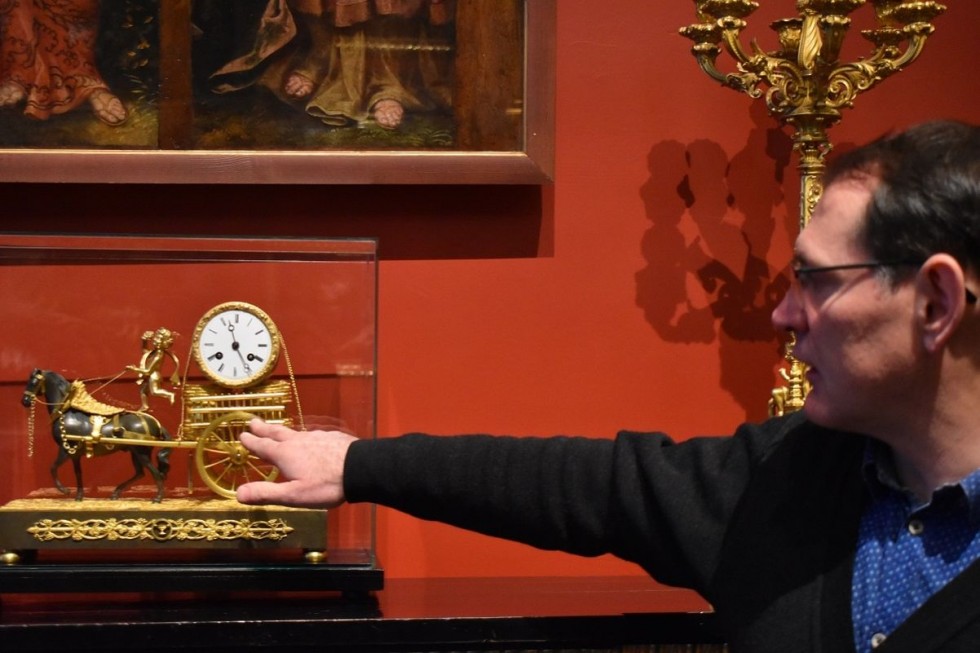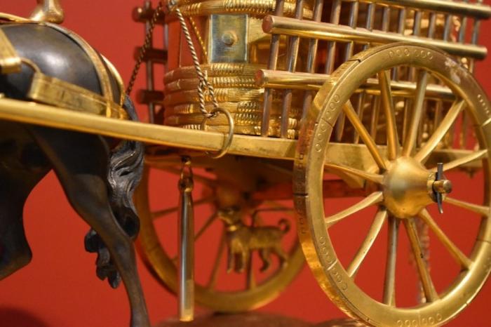 Такая необходимость возникла при восстановления утраченной сбруи лошади. Сейчас часы установлены на полушкафе в зале «Западноевропейского искусства». Они покоятся на деревянной подставке, а поверх них прозрачный стеклянный короб.