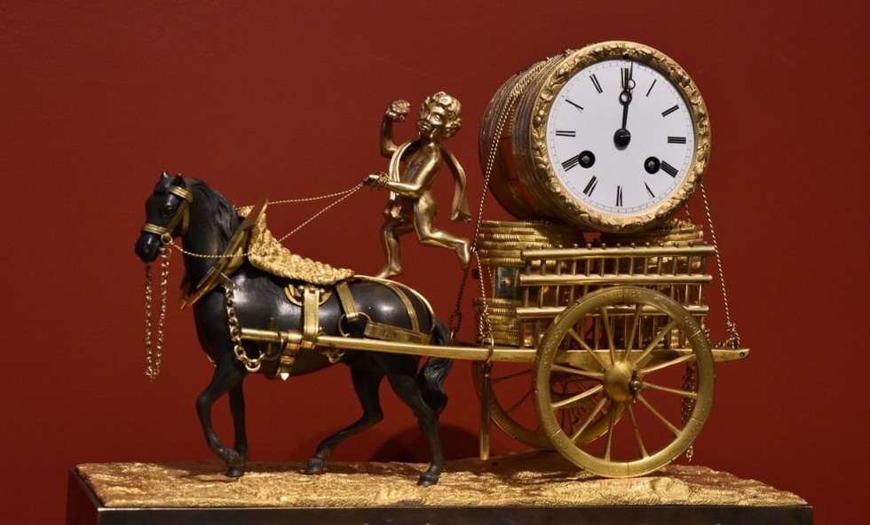 Приходящие в зал «Западноевропейского искусства» музея Врубеля посетители, глядя на этот эффектный предмет интерьера, даже не подозревают, сколько усилий потратилось, чтобы он их радовал. Перед реставрацией экспонат хоть и назывался часы, но представлял из себя бронзовую лошадь, которая была запряжена в повозку без ездока и с полой бочкой.