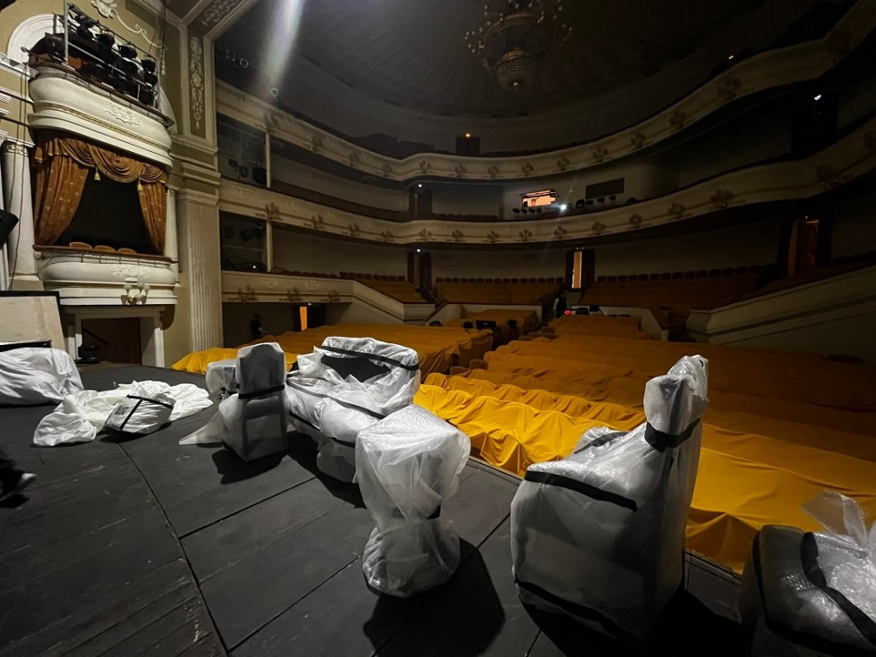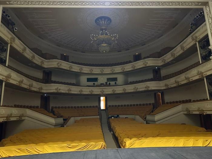 На снимках директора, иллюстрирующих пост, шикарный зал донецкого театра, где, судя по фото, проходит пристрелочная репетиция спектакля "ПУФ, или Ложь и истина" (16+).