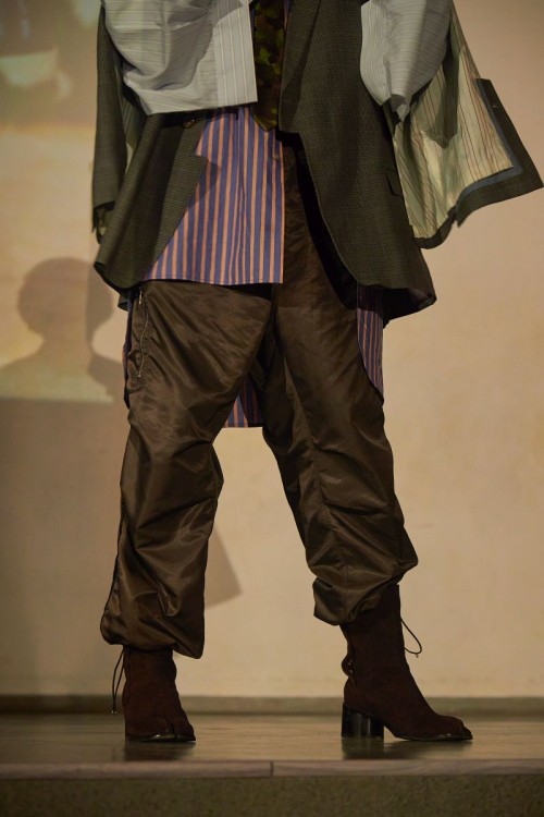 Образ дополняют шаровары, рубашка навыпуск в вертикальную полоску и галстук из ткани, выдержанной в в военизированном ключе.