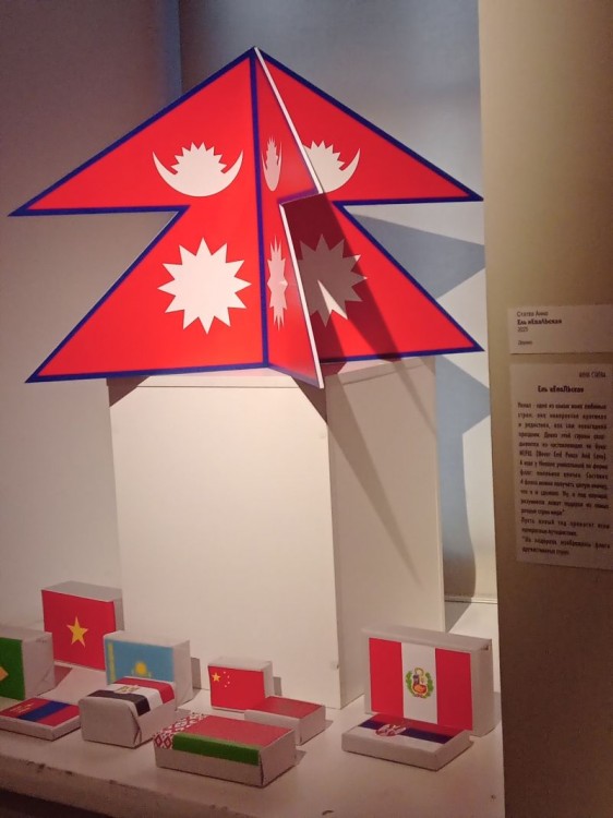 «У Непала уникальный по форме флаг: половина елочки. Составив 4 флага можно получить одну елочку, что я и сделала», - написала в своей аннотации к произведению бизнесвумен от туризма.