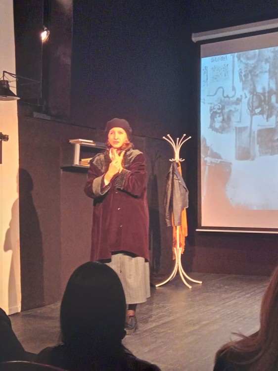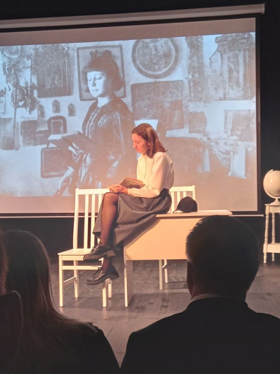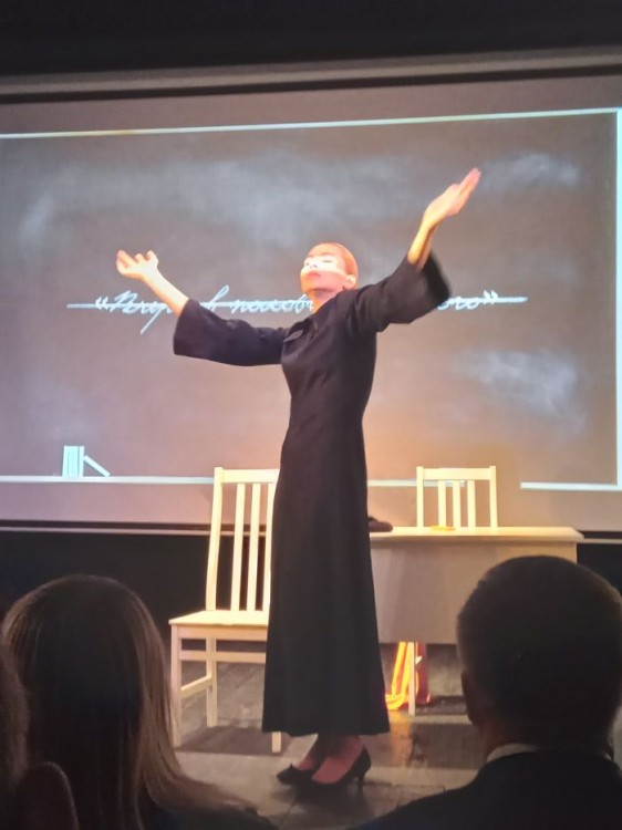 И надо отдать должное, с этой областью в спектакле московского режиссера Сергея Батаева все отлично. Прежде всего стараниями опытной Натальи Виташевской, которая легко перевоплощается из образа строгой училки в саму Анну Ахматова, практически не используя для этого никаких внешних аксессуаров.