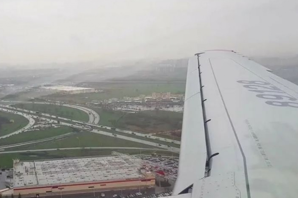 В частности, запорошенными были левая опора шасси, капот левого двигателя, нижняя часть фюзеляжа и левая консоль крыла. Пока борт компании «Авиа Менеджмент Груп» двигался к месту стоянки, он тоже оставлял за собой серый след.