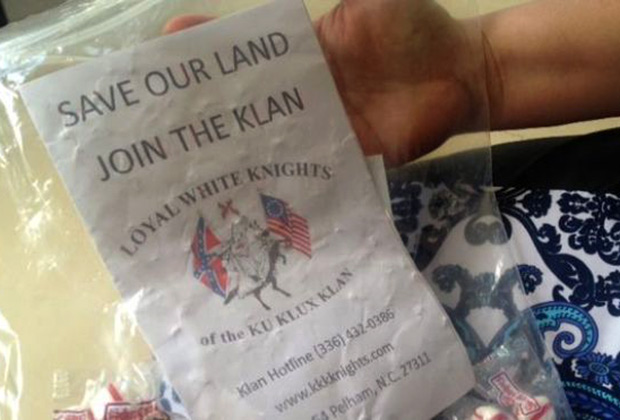 Эта забавная и в то же время жестокая шутка облетела американские СМИ. Несмотря на то что уже второй срок подряд страной управляет чернокожий президент, а жители США стараются быть толерантными друг к другу, в стране существует немало организаций-последователей праворадикальной структуры прошлого. Но дело ку-клукс-клана, созданного в 1865 году, все же живет на просторах Соединенных штатов. Утром 15 июля жителей округа Оконти удивили необычными гостинцами, оставленными на пороге дома. Это были пластиковые кульки с конфетами, на котором была наклейка с изображением всадника в белом балахоне с горящим крестом в руке. Картинка сопровождалась надписью: «Спасите нашу землю — вступайте в Клан» и подпись: верные белые рыцари ку-клукс-клана. Также были даны координаты для всех желающих свзаться с ку-клукс-кланом: телефон горячей линии клана и адрес сайта организации.